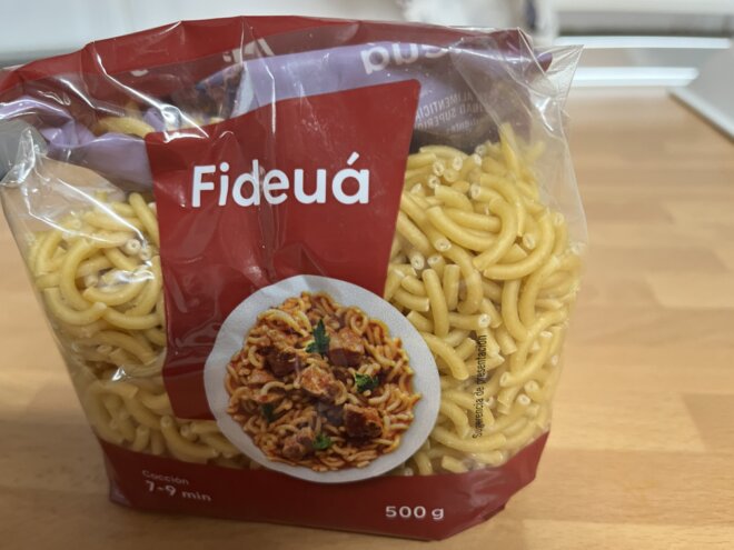 - Poner en una sartén o paellera el AOVE y dorar el secreto ibérico. Retirar y reservar. Se añadirá a la sartén cuando los fideos estén casi hechos.